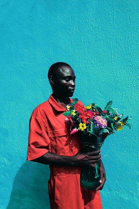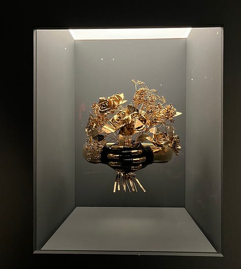 The shadowbox display of a Balmain belt that looks like a pair of hands holding a bouquet of flowers. At first glance I thought the belt was from the museum’s decorative arts department. Balmain’s creative director, Olivier Rousteing, drew inspiration for the belt from a photograph by the Ghanaian artist Prince Gyasi. In Gyasi’s photo a man in a red jumpsuit holds a bouquet of flowers.