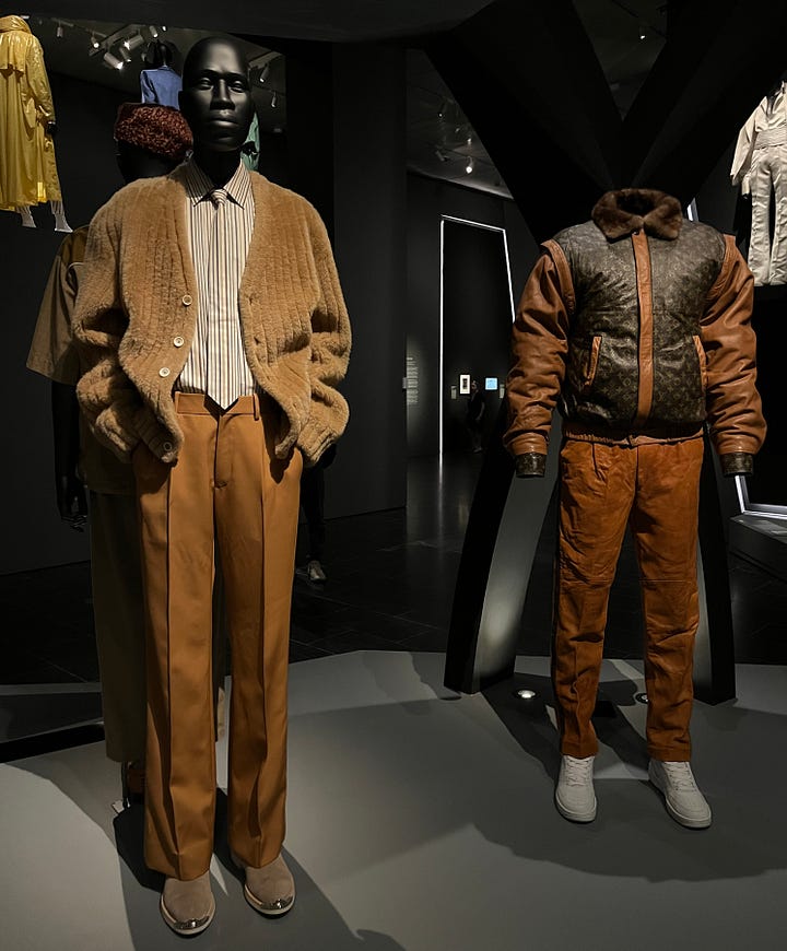 Bolton and Miller sort their bounty into twelve themes, each given an unimaginative, straightforward, single-word title like Ownership, Champion, Heritage, Cool, Cosmopolitan, Beauty. I like the idea of a theme as an organizing tool, but twelve of them felt excessive. The objects are grouped along obvious and simplistic lines. The Heritage section includes clothes made from African textiles. Louis Vuitton luggage trunks sit stacked in the Cosmopolitan corner. And clothes related to music, like a Dapper Dan jacket worn by Jam Master Jay of Run-DMC, and a contemporary outfit meant to represent the midcentury style of Miles Davis and John Coltrane, fall under the Cool umbrella.