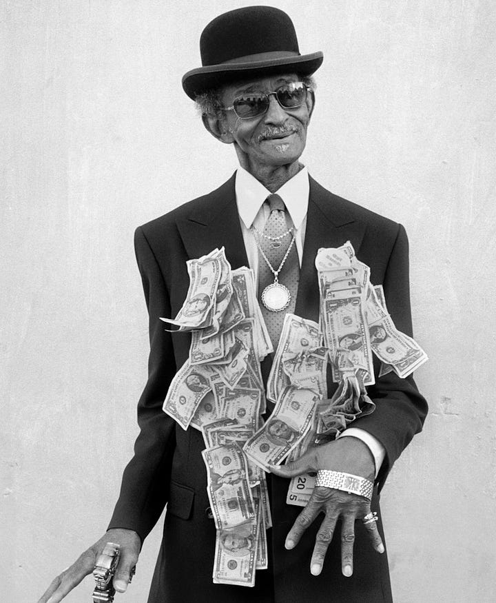 The Andy Levin photograph of New Orleans’s own musical legend, Uncle Lionel Batiste, wearing sunglasses, a top hat, and a suit jacket covered in cash for his birthday. In the photo, Uncle Lionel balances a cane in one hand and wears his watch over the other hand because if he kept it on his wrist, we might not be able to see it. And he wants us to see it.
